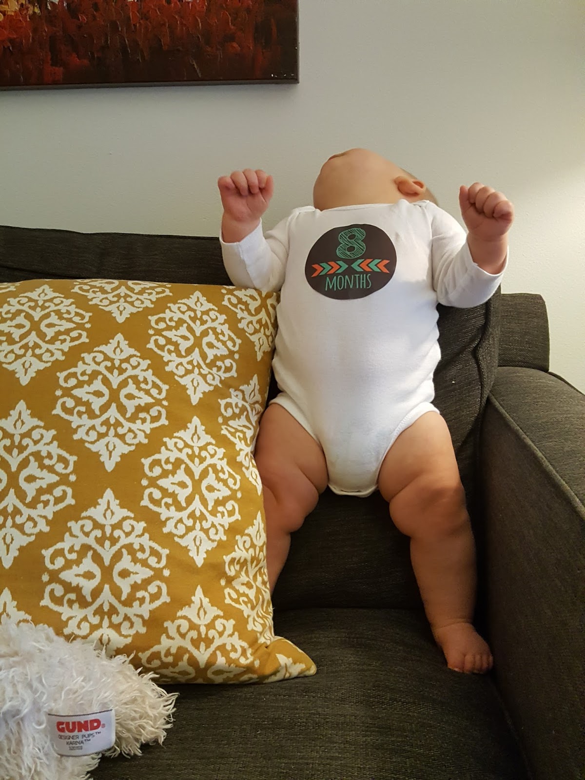 Seriously how is he so chunky? That last pic though. 😂 I'm also laughing that I happened to get that spit up in motion. Yes he's still spitting up! Just a couple weeks ago he made me change my pants 3 times before leaving the house. It's as if he was saying "nope, those ones aren't good enough, try again!" - thanks for keeping me fashionable, little boy. 😉 Other tidbits at 8 months: